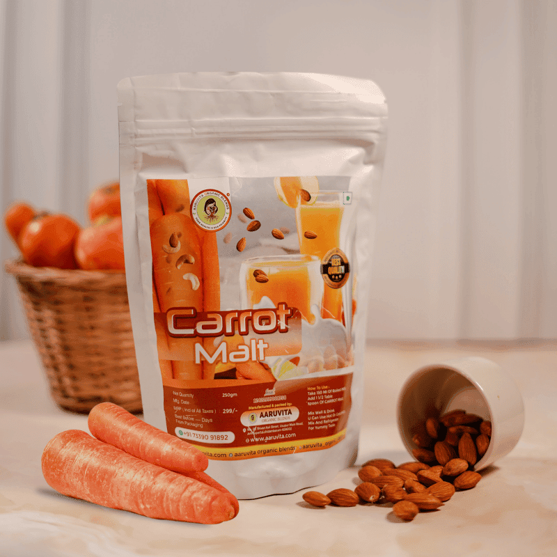 Aaruvita Carrot Malt is prepared using 5 ingredients. It is a powder product and it is one of best instant mix for all group of age. We use carrot, badam, cashew, country sugar, cardamom to make a carrot malt powder. We have added badam and cashew in this powder to increase nutrition level Mix 2 table spoon for our carrot malt with 200 ml of boiled milk and drink it every day morning and evening to boost your energy level. In summer days, we can intake it after chilling it.