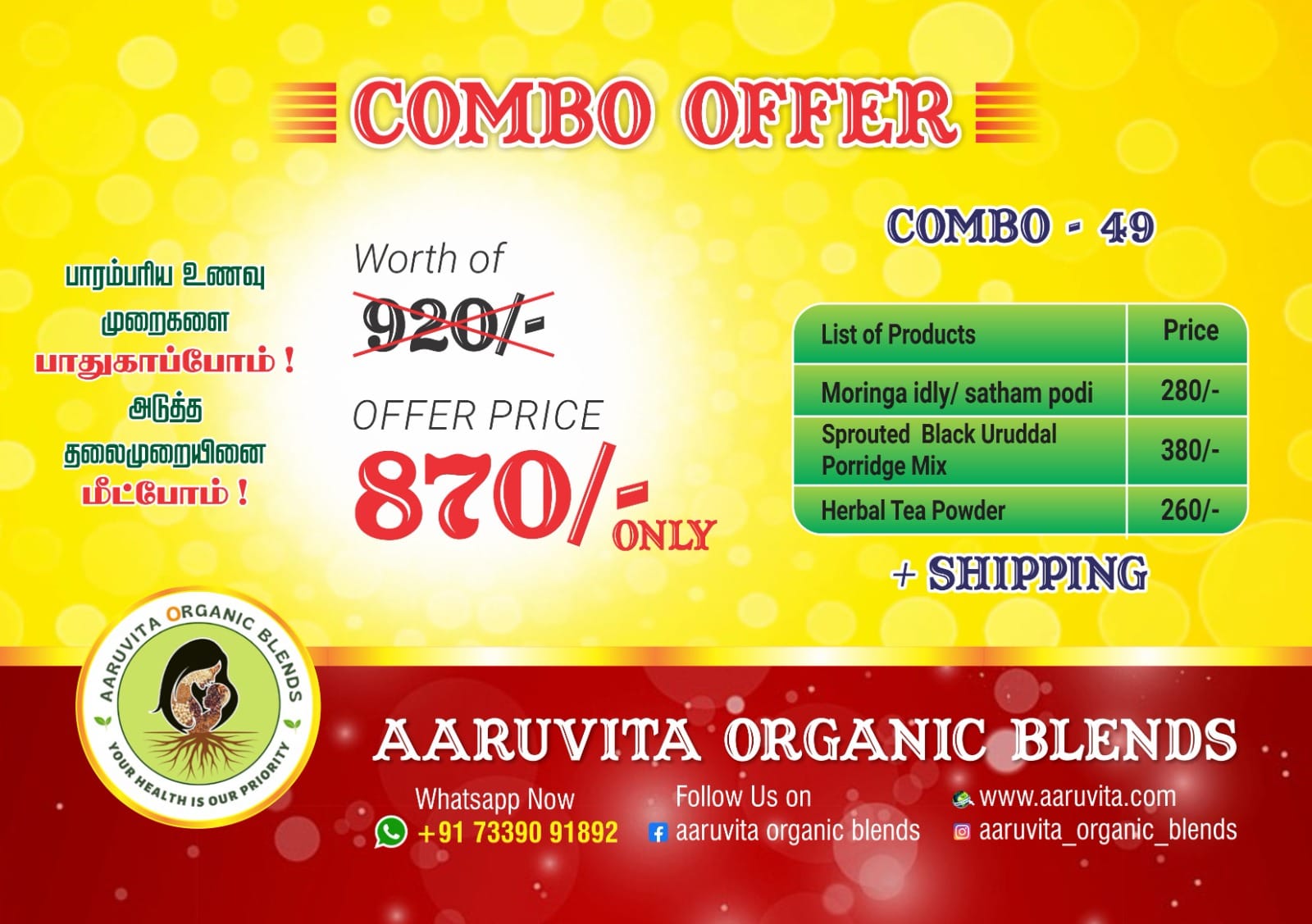 Combo with Moringa idly/sambar podi,sprouted black uruddal porridge mix